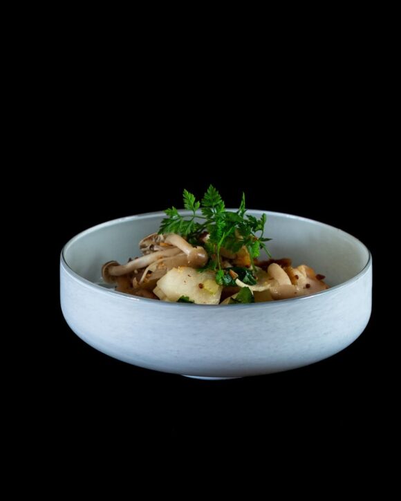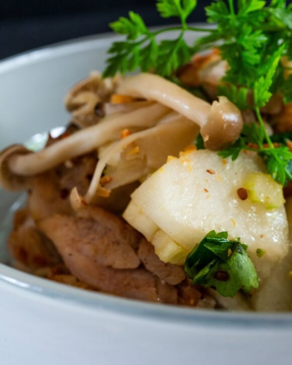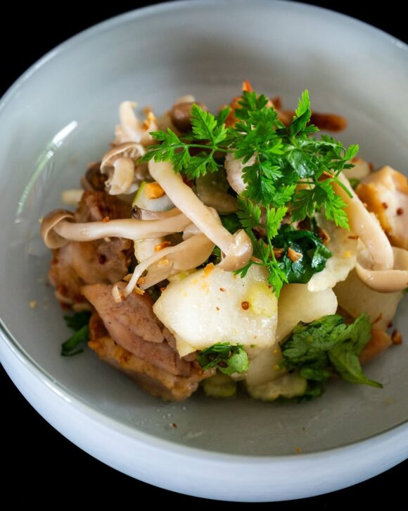 盛り付けは料理家・宮島綾子さんに作っていただいた、梨ときのこ、鶏肉を合わせた一皿で、みずみずしい果実の甘みと香ばしさが引き立ちます。
