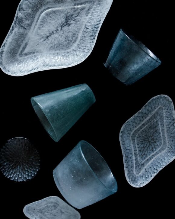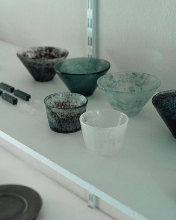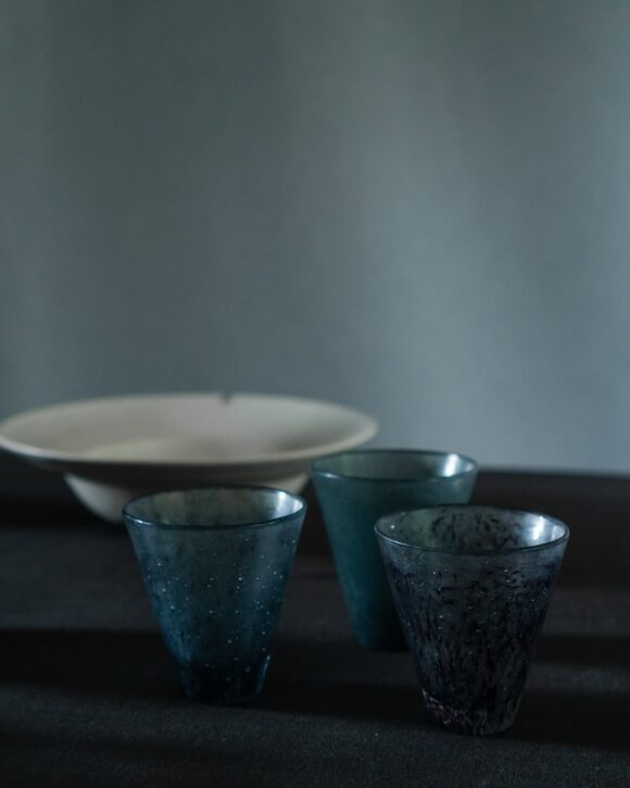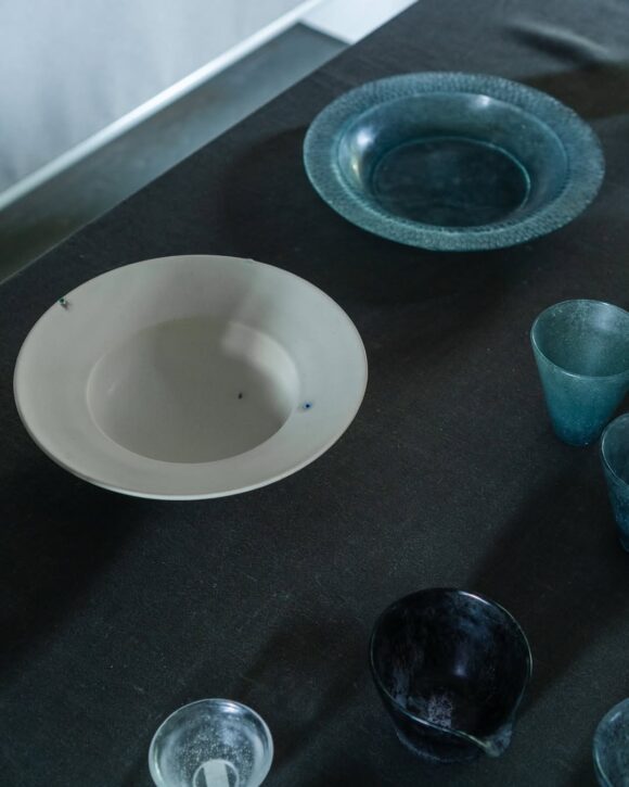 静かな表情を見せる大久保さんのうつわと、深い碧をたたえるミウラさんのガラス。