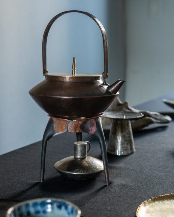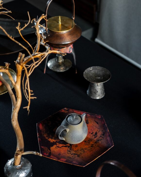 本展「Perpetual」では、茶の時間に寄り添う道具を中心に、多様な金属による新作が並びます。