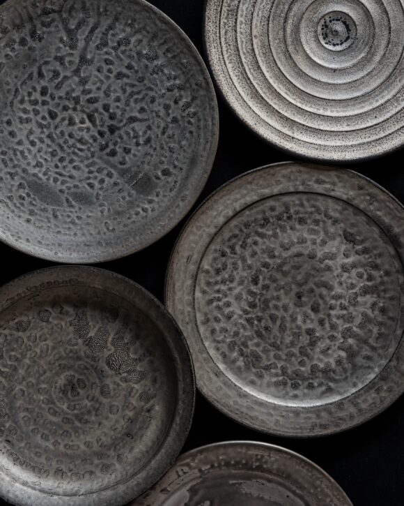 うつわの表面には、土・黒・銀という三層の構造が重なり合っています。