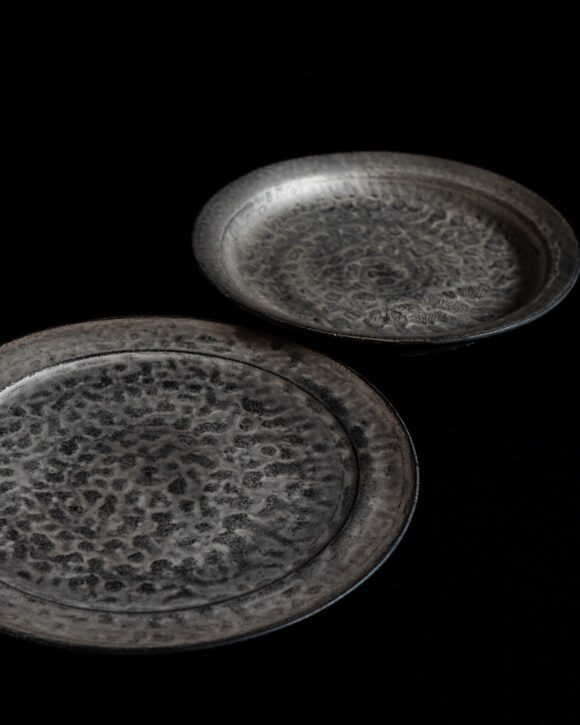 荒々しい土の質感、黒く焼き締められた下地、そしてその上に施される銀。