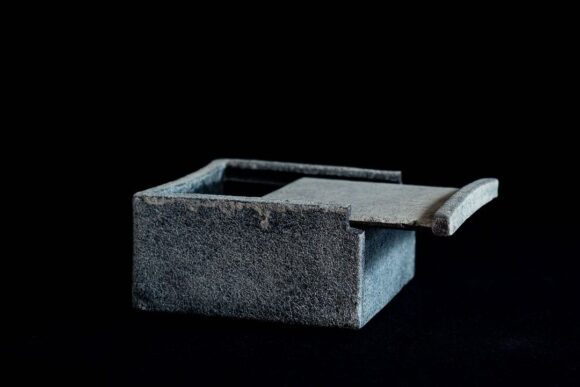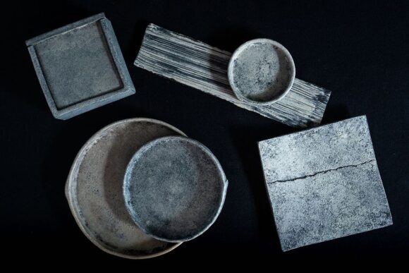 主に板作りで成型した陶土に、「粉打」という化粧土を重ねる技法を使い、土肌を感じる印象的な作品を作られています。