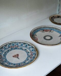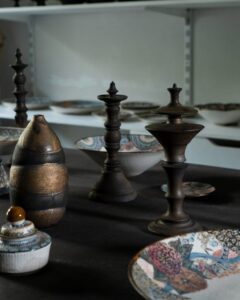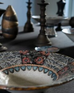 ブロンズ釉で重厚な佇まいを見せる吉田丈さんの造形と、イッチンとオリジナリティは触れる絵による緻密な装飾が美しい樋口早苗さんのうつわ。