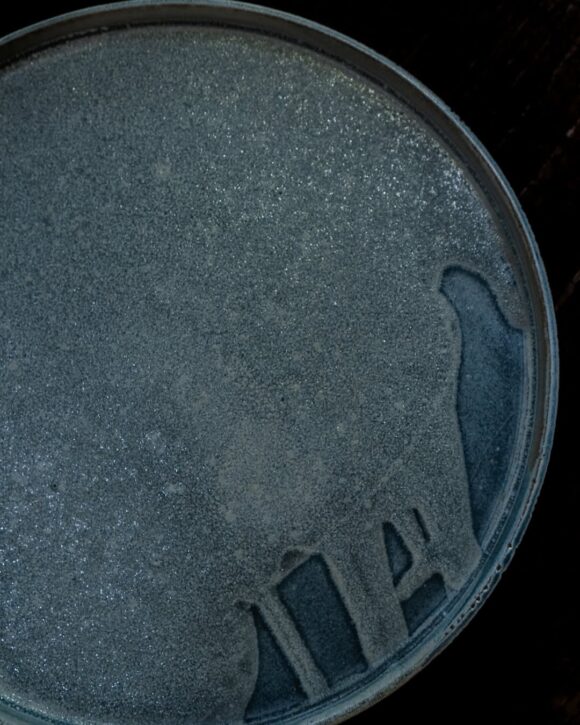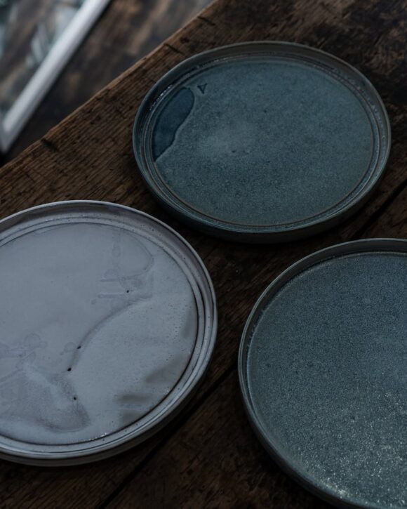 ブルーグレーの釉薬がきらめき、自然が見せてくれる様々な景色を想起させます。
