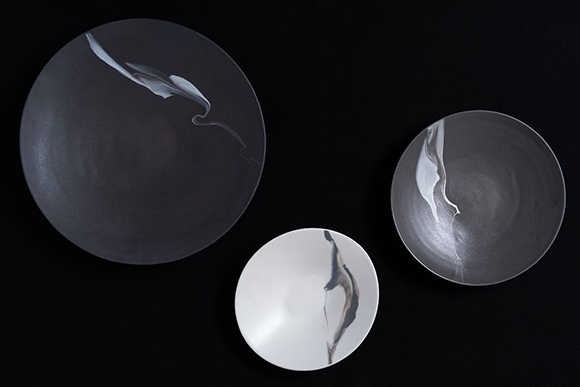 「墨流し」という技法使った、モノトーンの濃淡の色味は水墨画を彷彿とさせます。