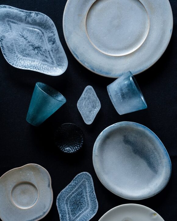 晩夏から秋へと向かう季節に、陶とガラスが重なり合いながら織りなす『八重霞』の景色を、ぜひお楽しみください。