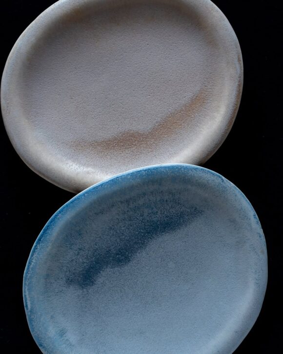 大久保さんのうつわは、淡いベージュやブルーグレーが幾重にも重なり、やわらかな陰影を帯びています。