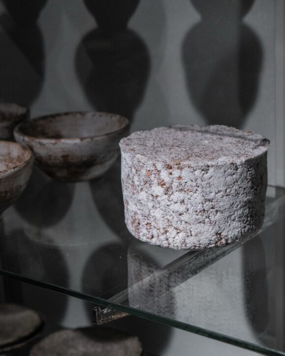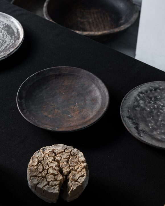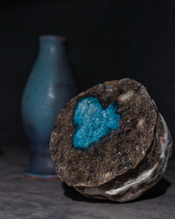 釉薬や珪石、ガラスなど、異なる素材を組み合わせて焼き上げています。