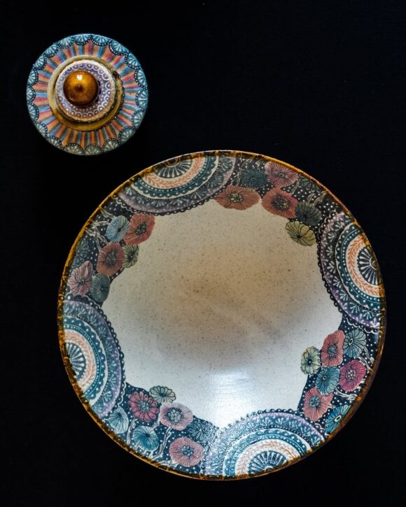 今回の写真に写るうつわでは、幾重にも重なる文様と植物の意匠が調和し、異国の物語を想起させます。