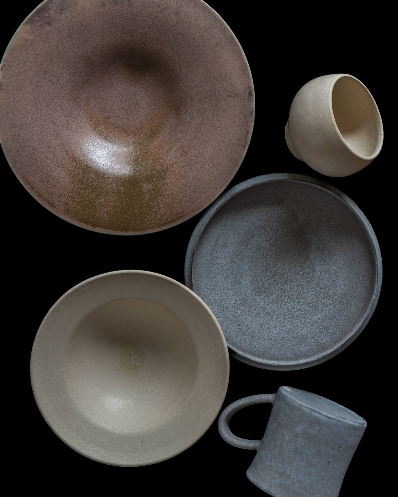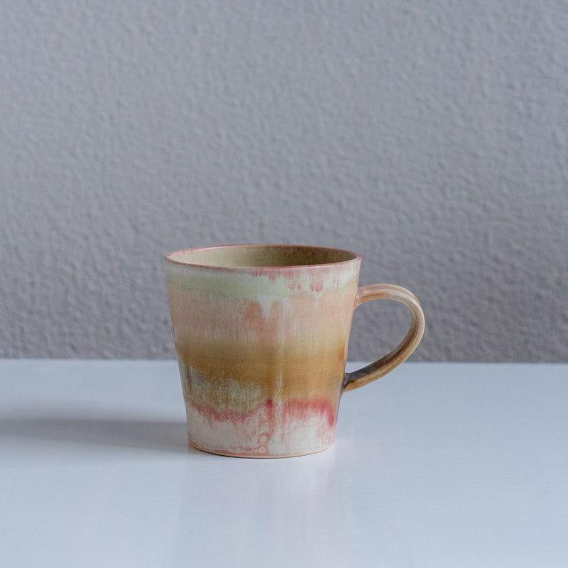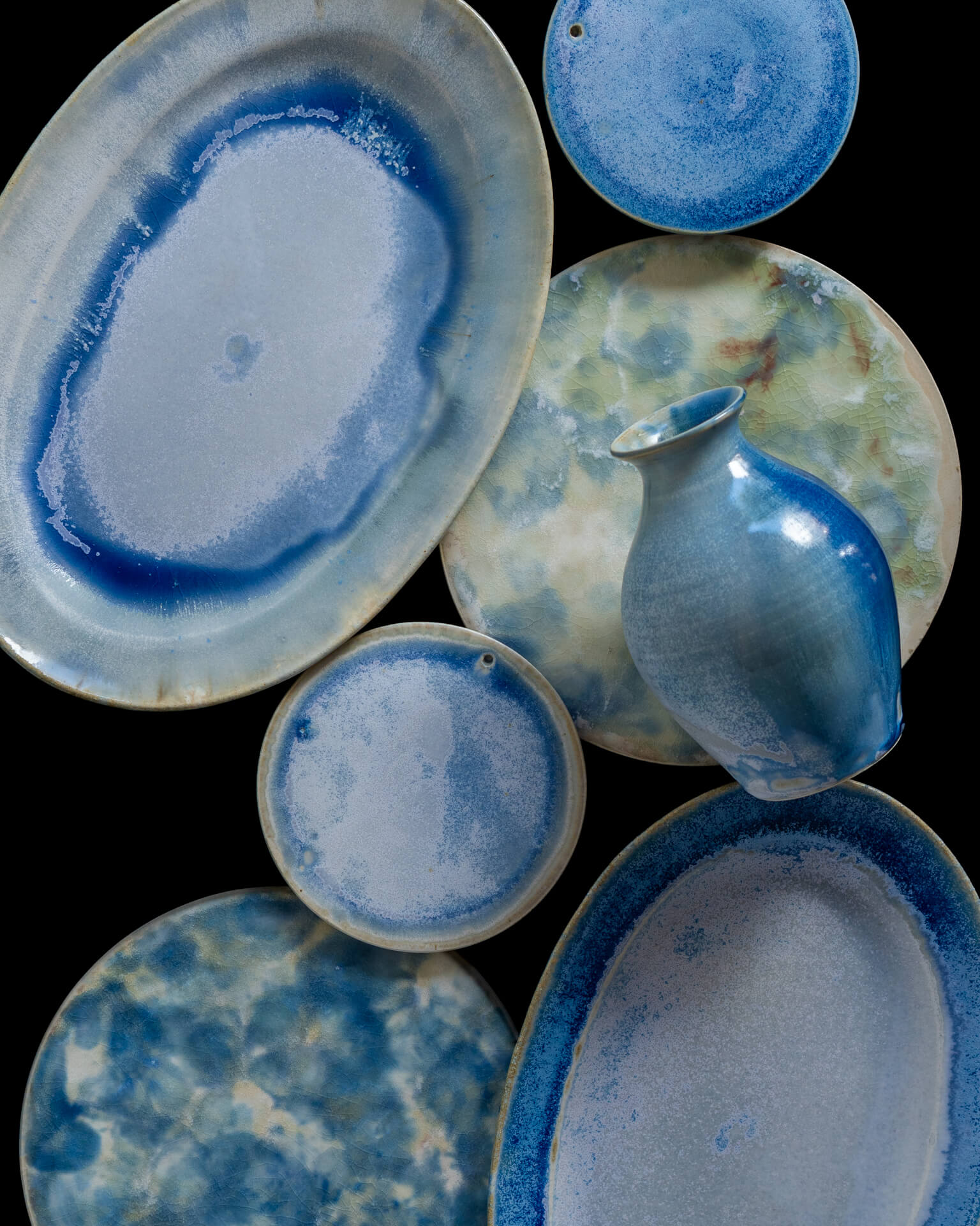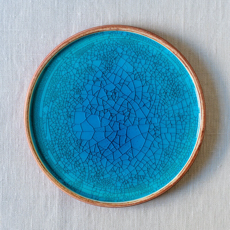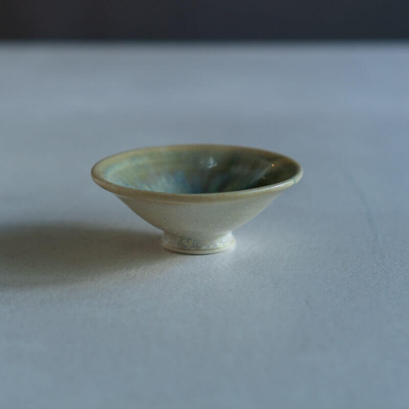 大渕さんの作品をかたちづくるのは、豊かな釉薬の表情です。色とりどりの釉薬が重なり、にじみ、溶け合いながら、火を経て美しい景色を生み出します。