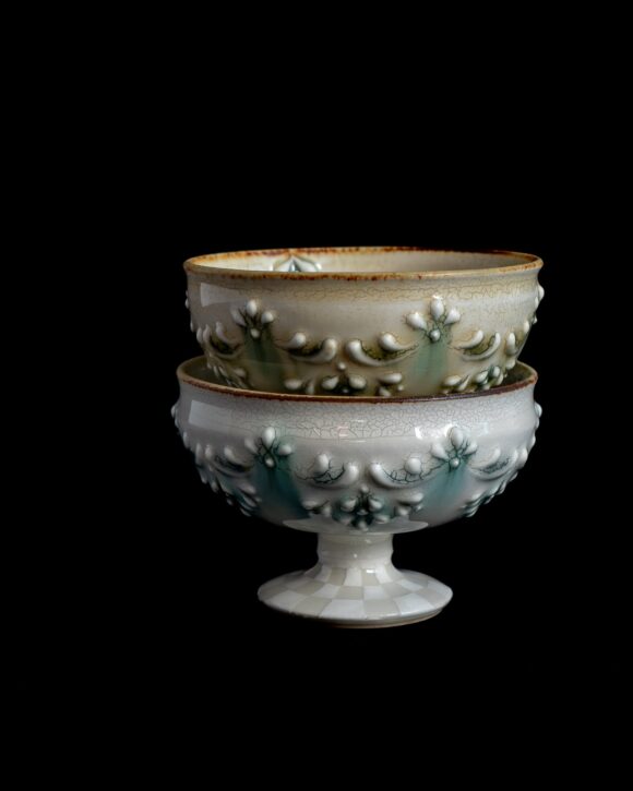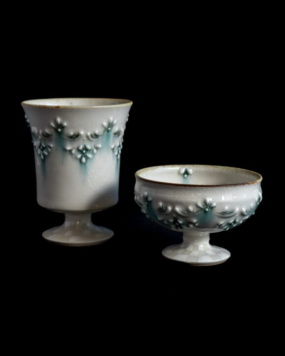 福田さんの作品は安南手といった絵付けが魅力的ですが、こちらのような筒描き(いっちん)という立体的な意匠のものもございます。