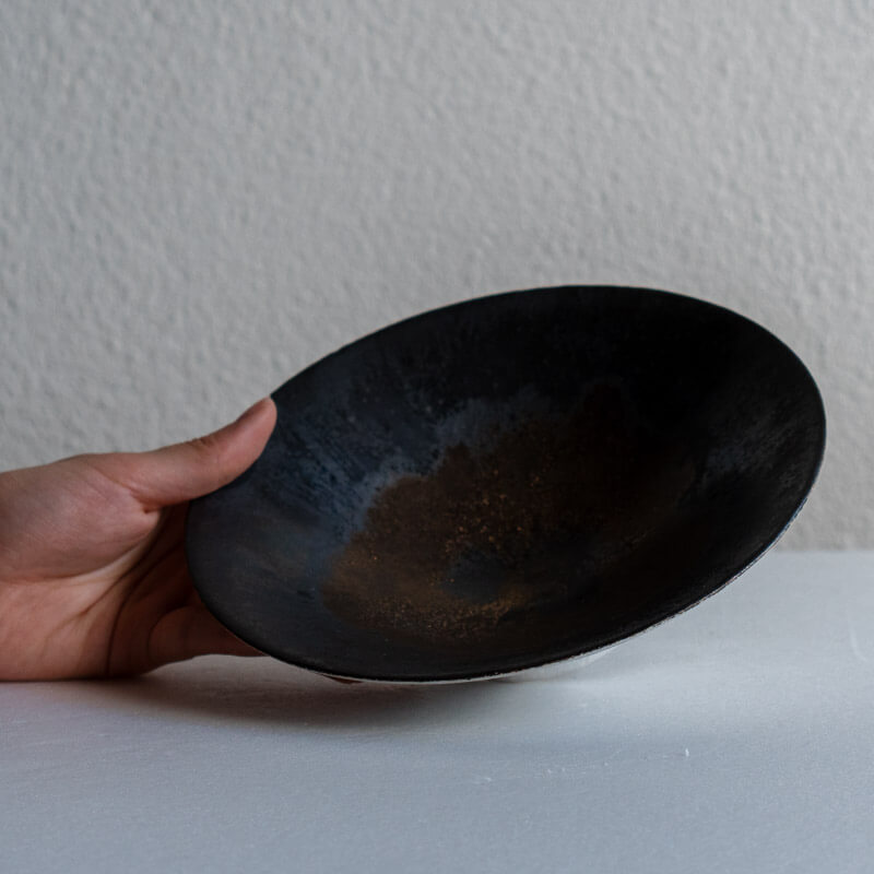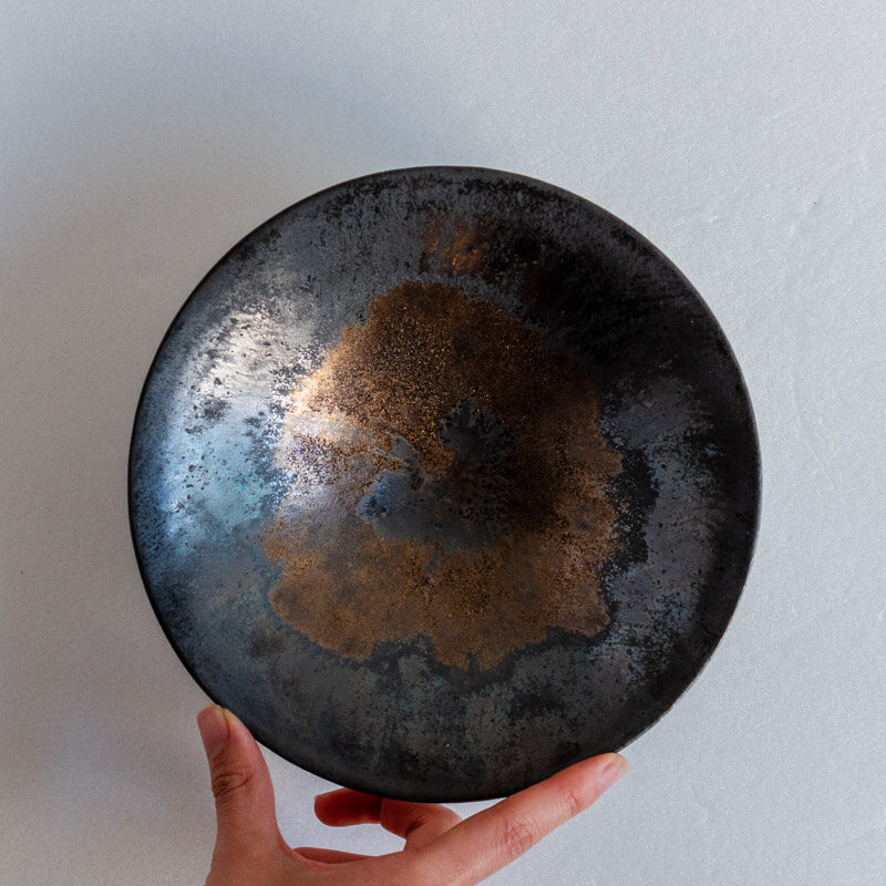 作品の種類は、樫の灰を使った「灰釉」と「黒灰釉」、金属系の「マンガン」「まだら釉薬」、そして新作の「鬼板」です。