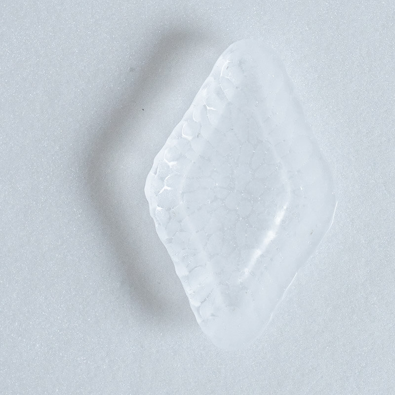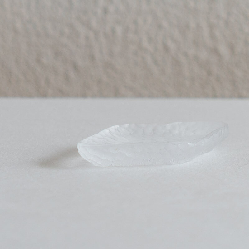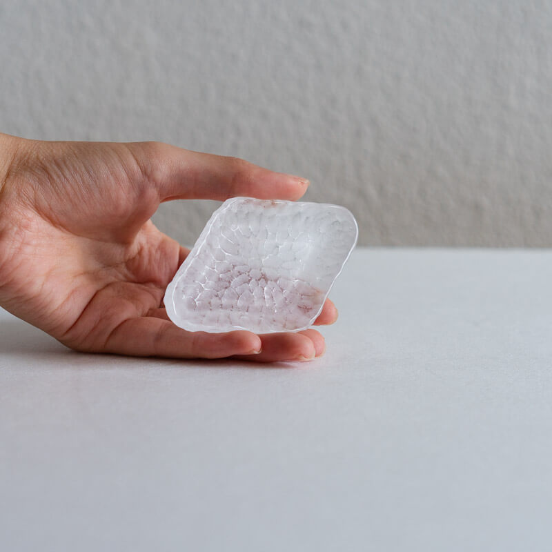 ミウラさんのガラスは落ち着いた色合いと細やかな気泡が、光を受けて積層した色が淡く揺らぎます。