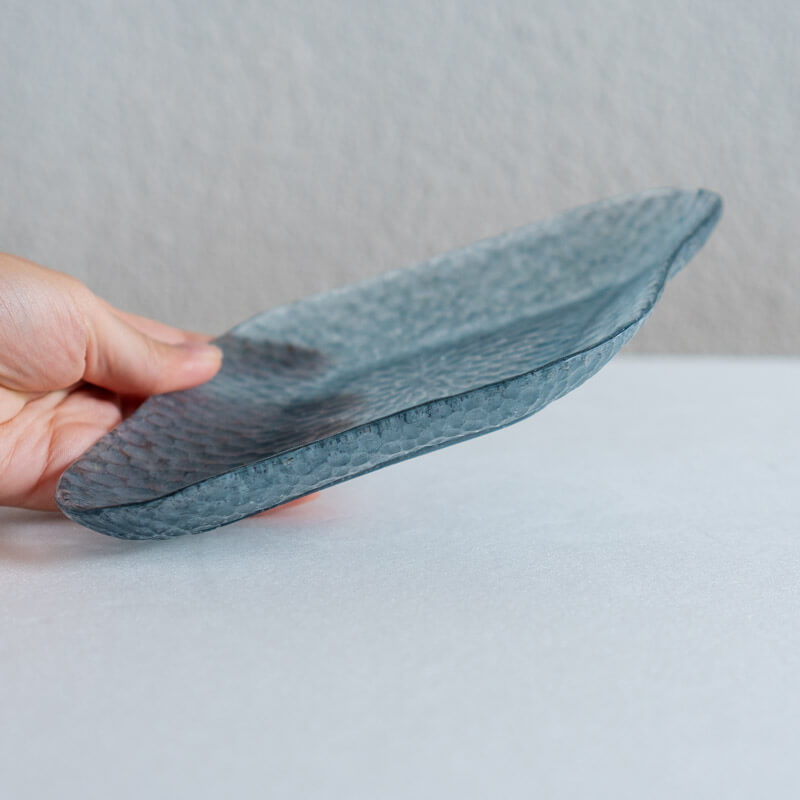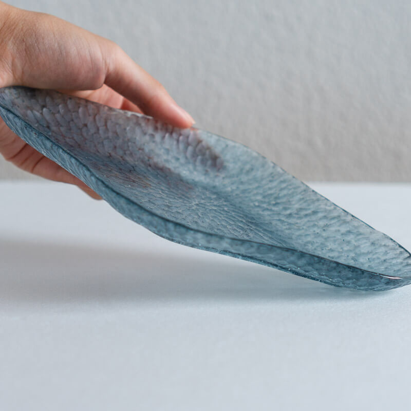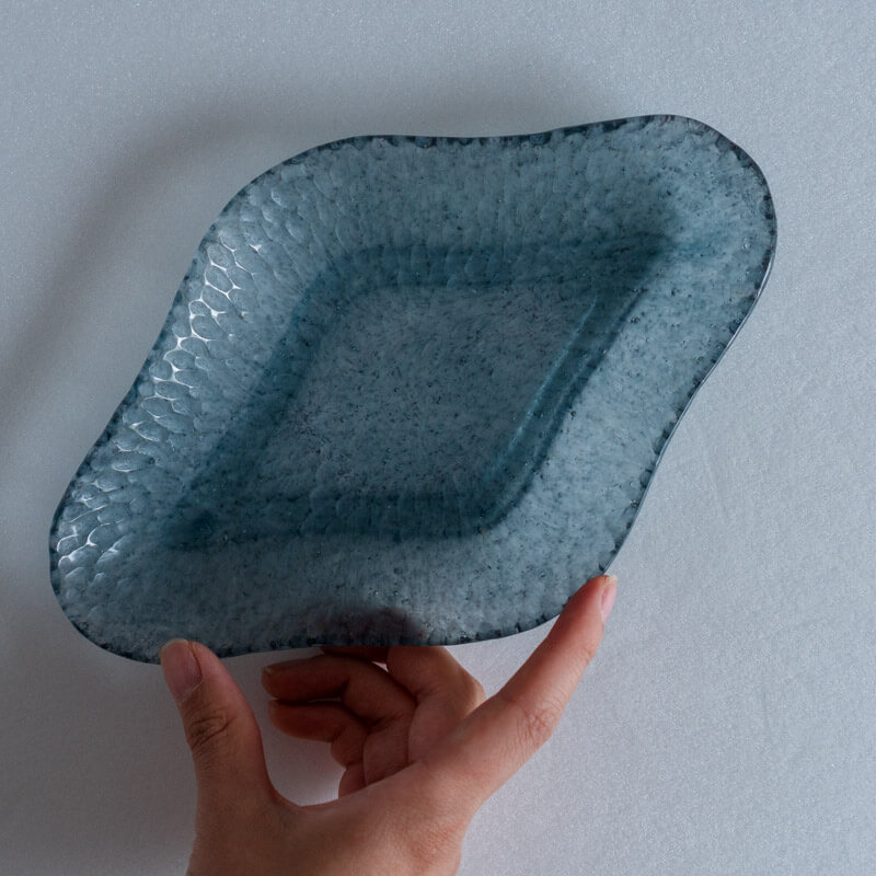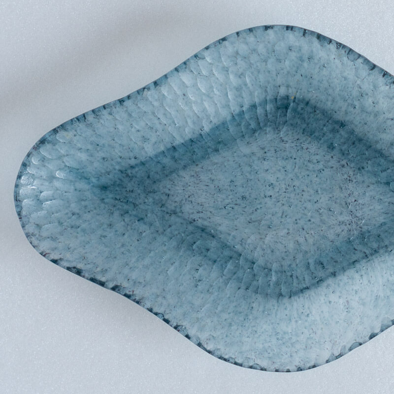 ミウラさんのガラスは落ち着いた色合いと細やかな気泡が、光を受けて積層した色が淡く揺らぎます。