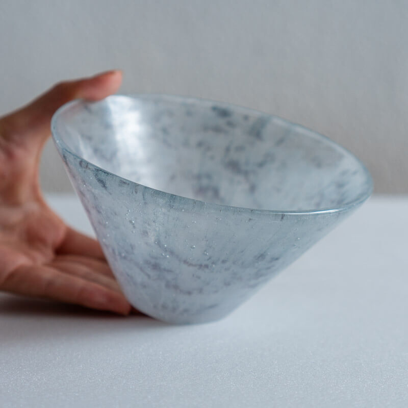 とても非効率な技法ですが、多層的な色味や細かな気泡などがガラスの中に閉じ込められた作品からは、