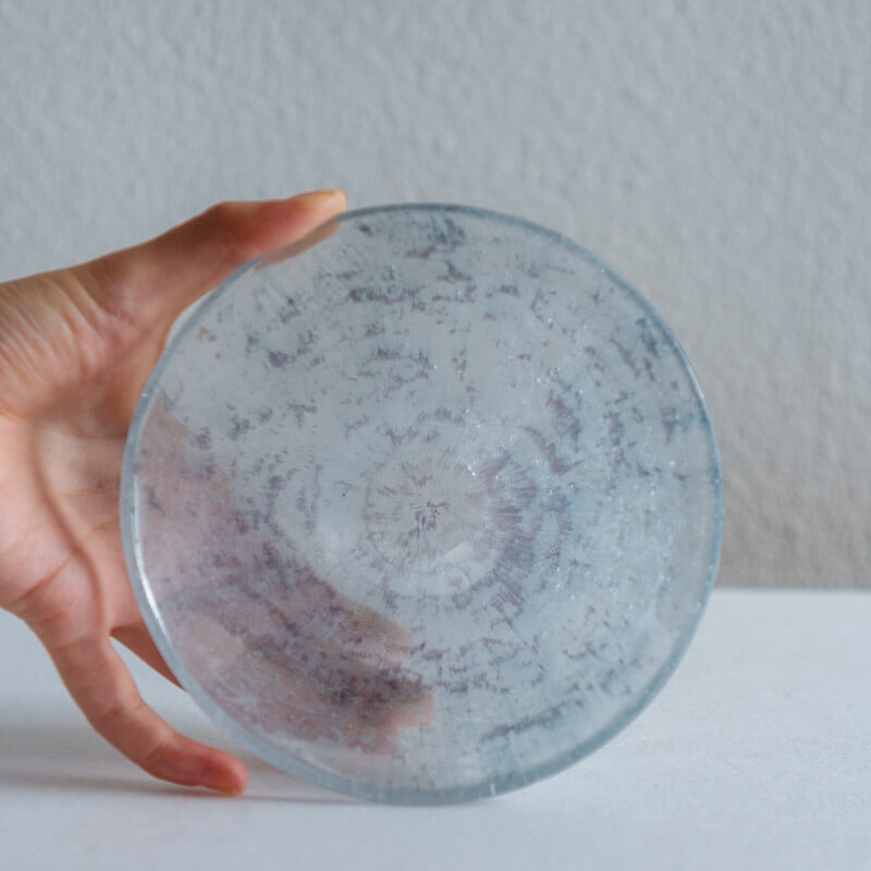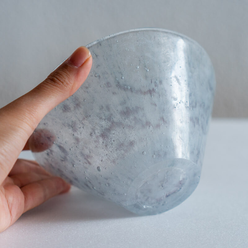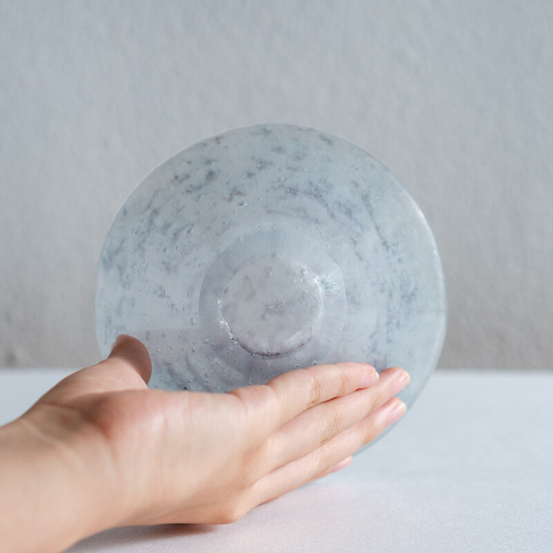 ミウラさんのガラスは落ち着いた色合いと細やかな気泡が、光を受けて積層した色が淡く揺らぎます。