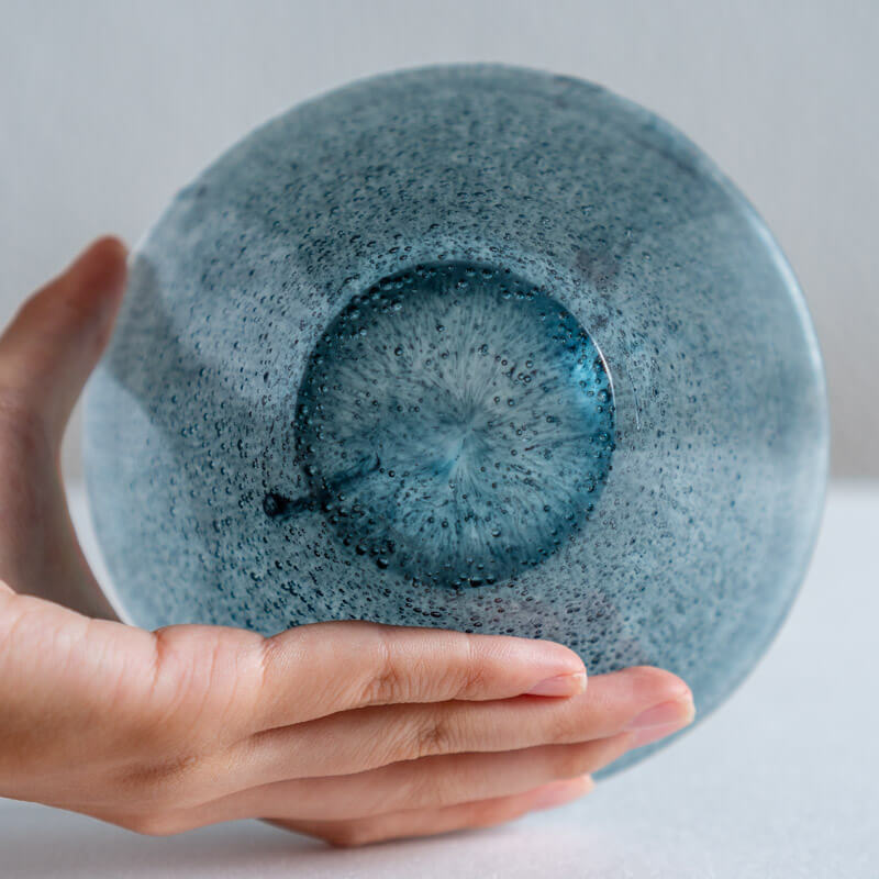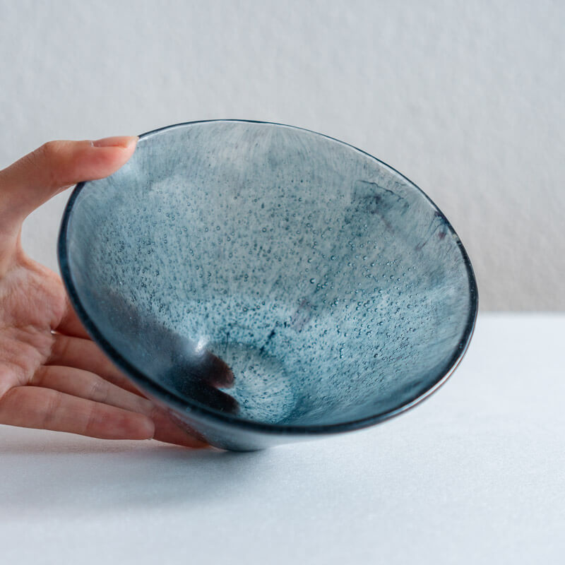 とても非効率な技法ですが、多層的な色味や細かな気泡などがガラスの中に閉じ込められた作品からは、