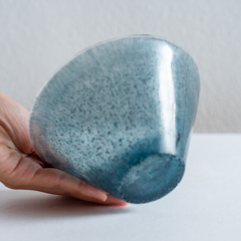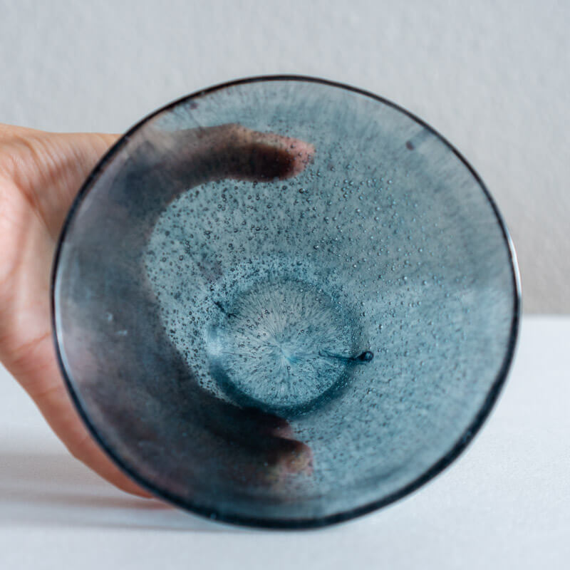 ミウラさんのガラスは落ち着いた色合いと細やかな気泡が、光を受けて積層した色が淡く揺らぎます。