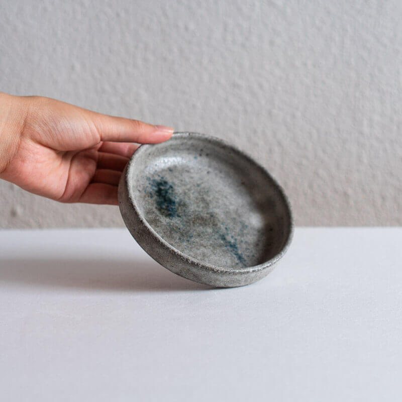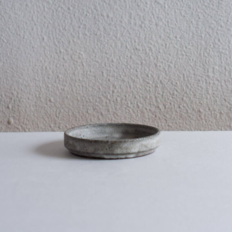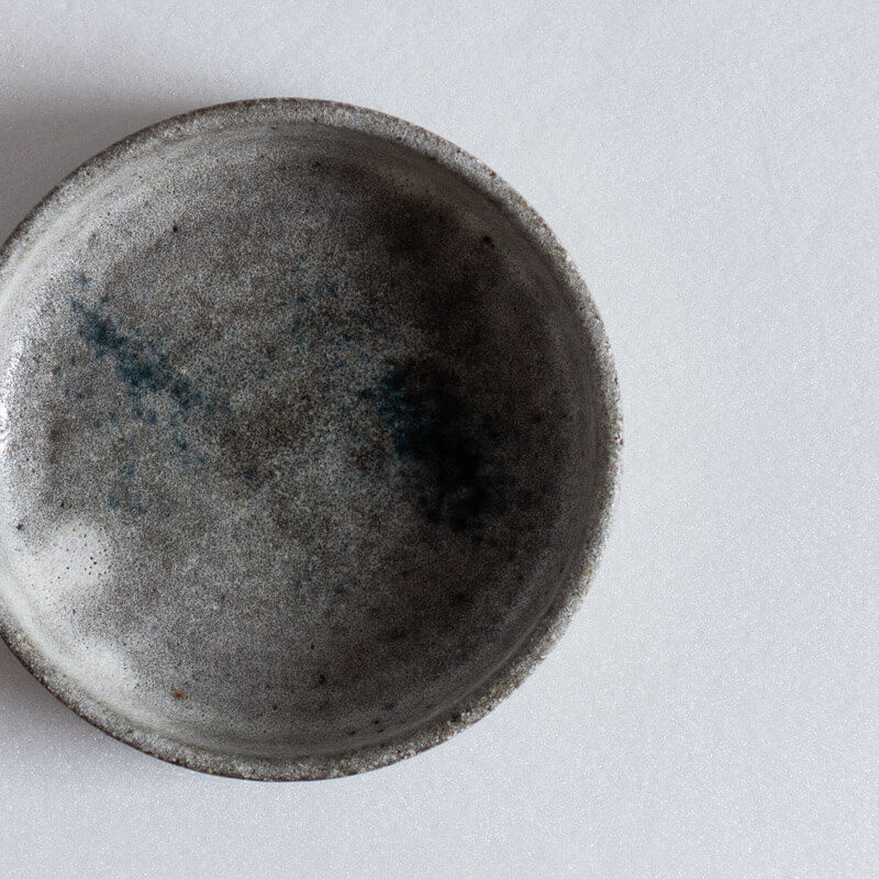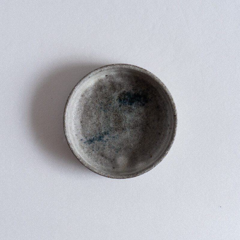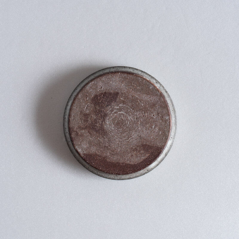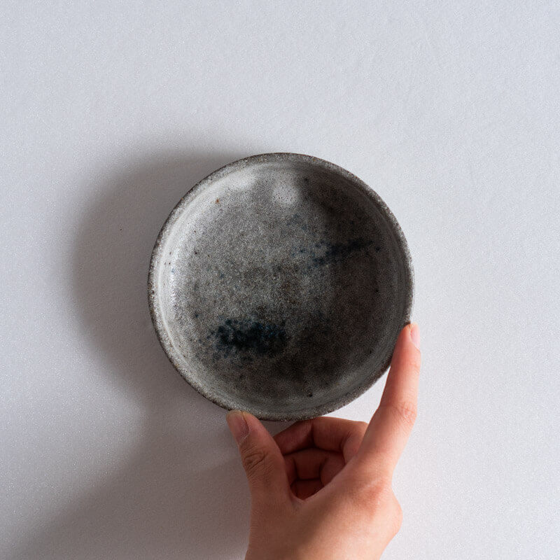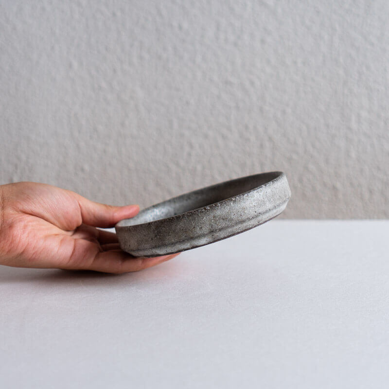細かな黒粒が浮かぶマットな灰色の釉薬が施されており、土感を感じる表面の質感と相まって、石壁や山肌を思わせるような深みがあります。
