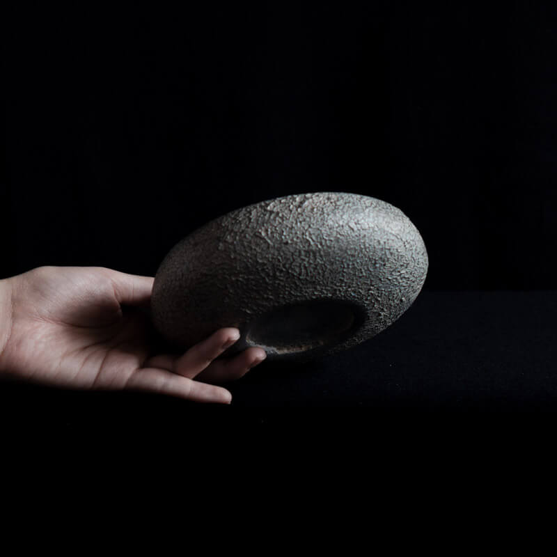 『陰陽』をコンセプトに、木工とは思えない程の非常に精巧なフォルムを削り出し、木地に漆を塗り砥粉を付着させる「蒔地漆」という技法を用いて立体感のある質感に仕上げられています。