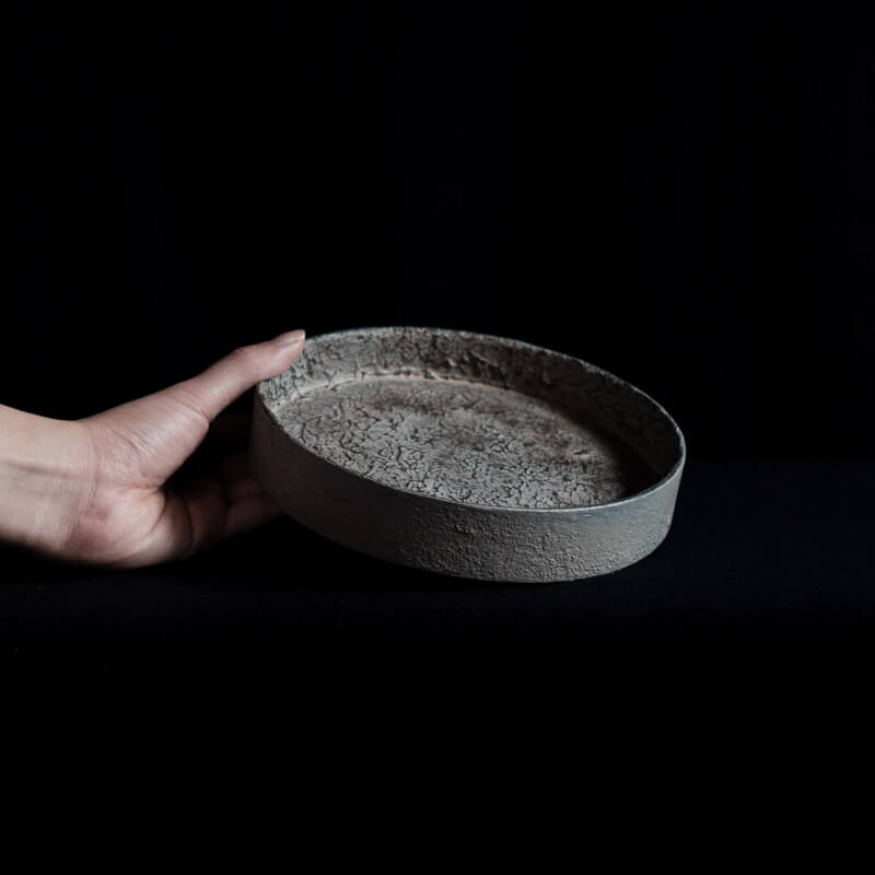 『陰陽』をコンセプトに、木工とは思えない程の非常に精巧なフォルムを削り出し、木地に漆を塗り砥粉を付着させる「蒔地漆」という技法を用いて立体感のある質感に仕上げられています。