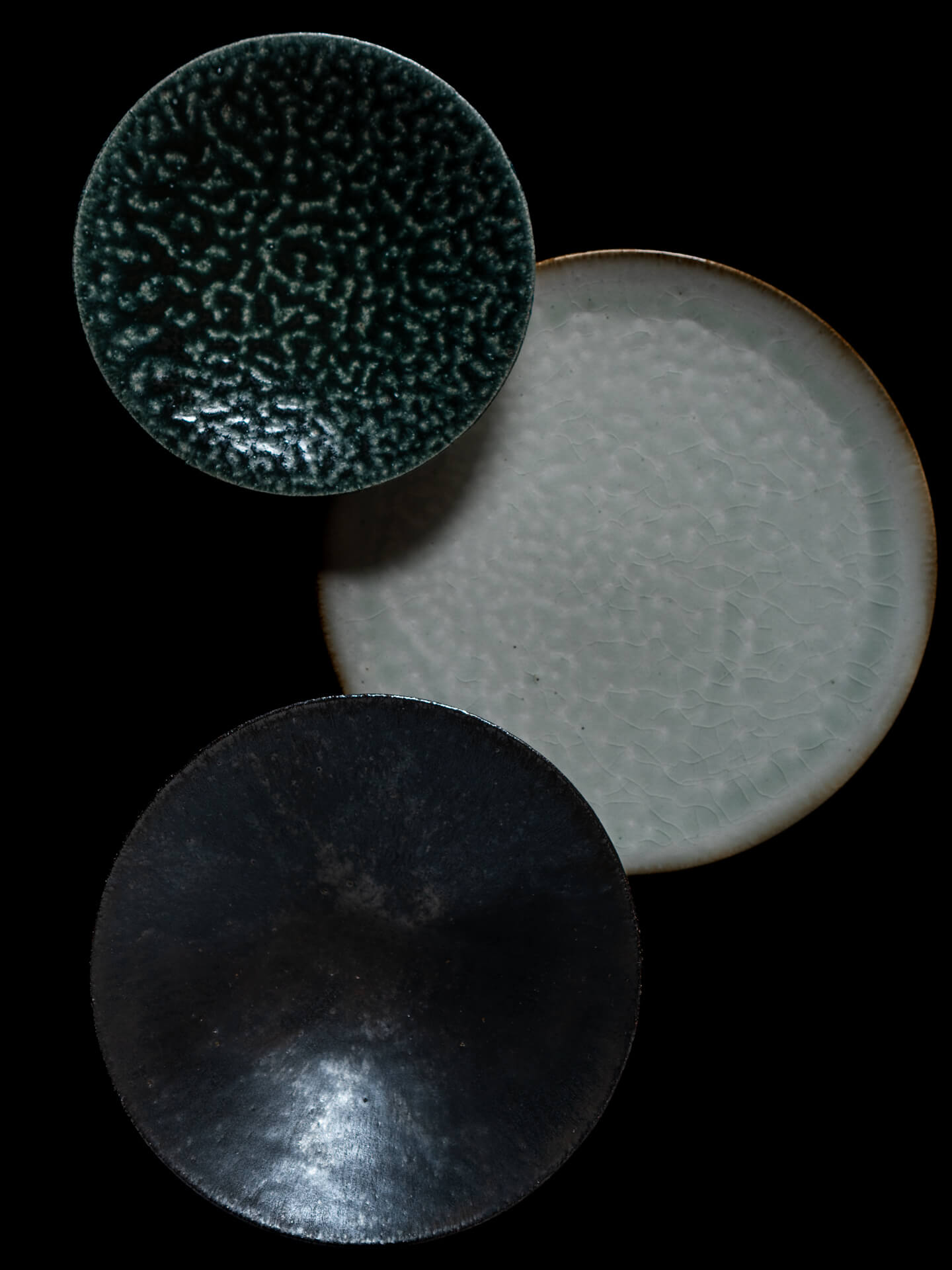 ロクロ成形による陶器のうつわを中心に、やわらかな白、硬質で凛とした黒、鈍く光る銀彩と、質感の異なる作品を手がけています。