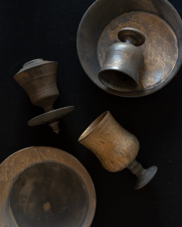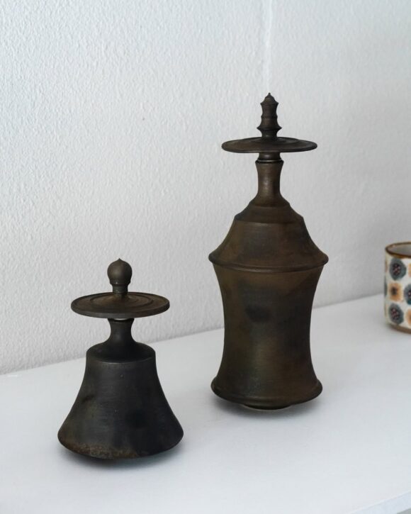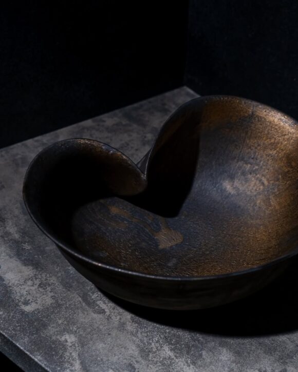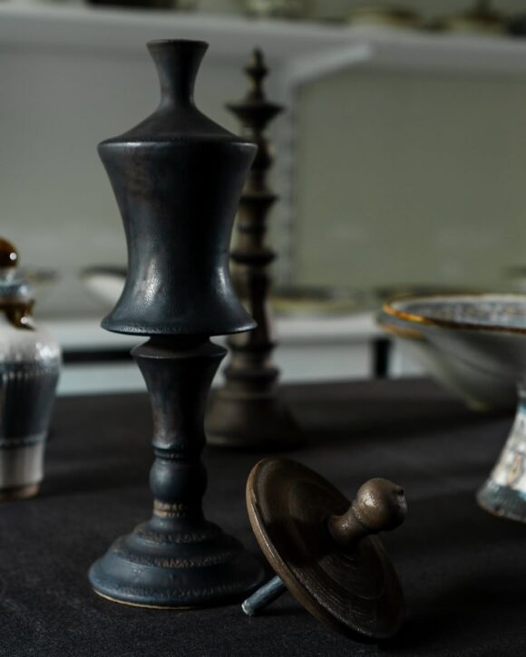 吉田丈さんは、古代文明の出土品を思わせる作品を手掛けています。 鈍い金属質を感じさせる「ブロンズ」、遺跡の壁面のような趣の「白」を中心に、重厚で奥行きのある作風を追求されています。 近年は蓋付きの作品にもこだわり、独自の世界観をさらに広げられています。